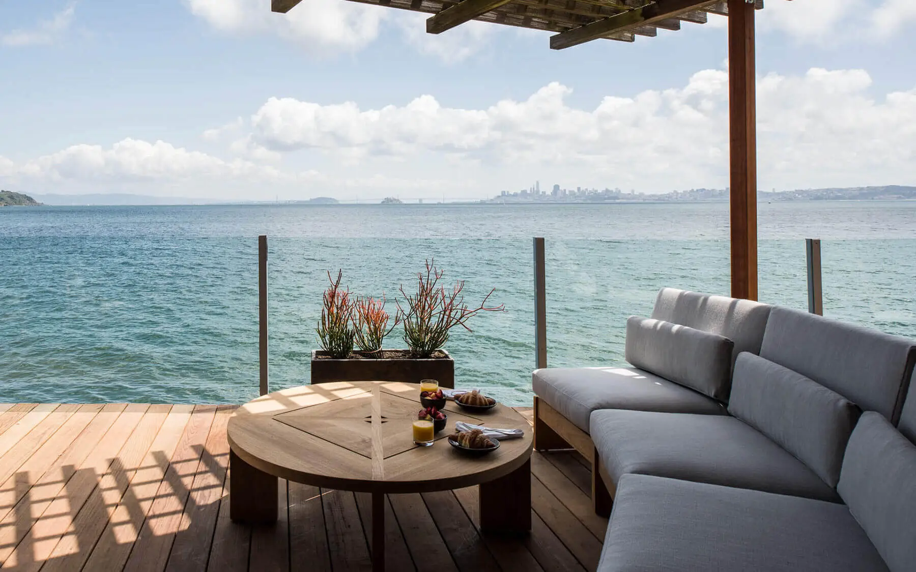 Thirty-one rooms suspended over the Bay — every room has a balcony hovering above the water.